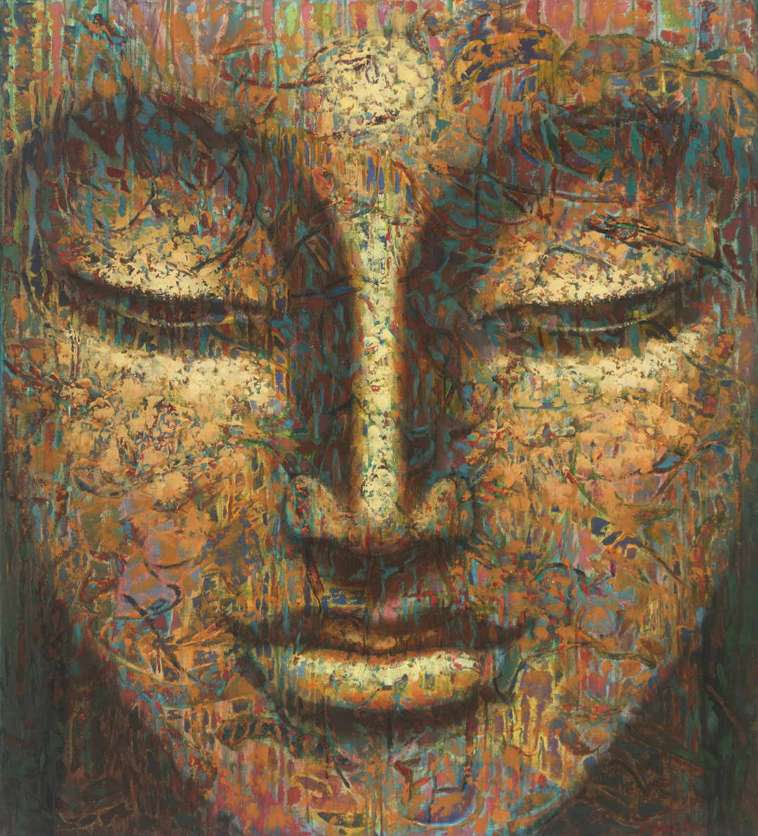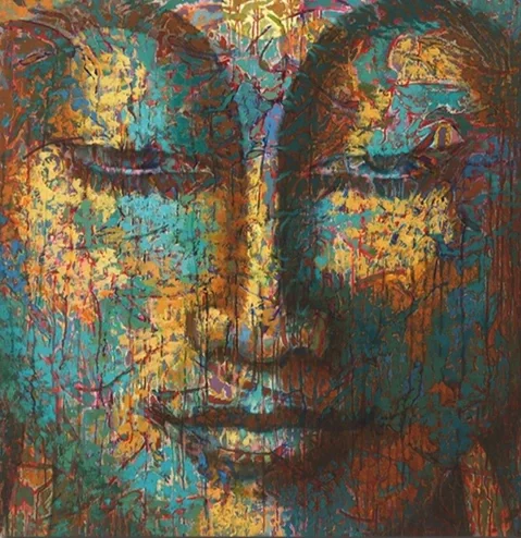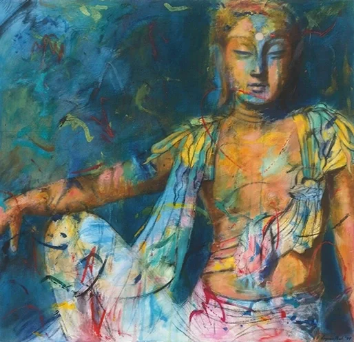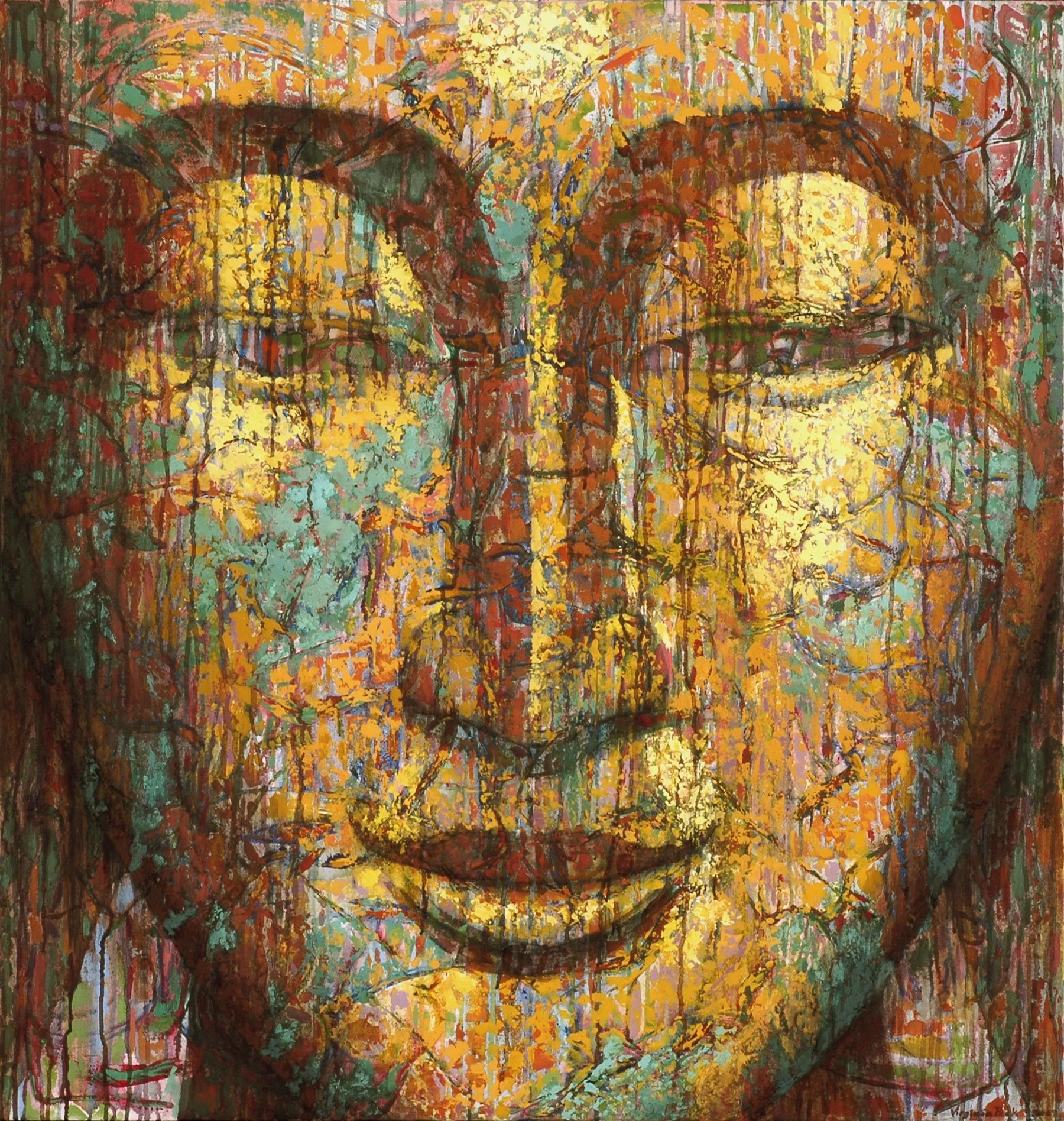 The colors that I use are always my own, inspired by the spontaneous, abstract under-painting, which is how I begin each painting (see Videos 1 and 2). Rather than recreate a dead, lifeless statue, I seek to depict a living Buddha, as an expression of the life of his teachings, whose energy and spirit live on today.