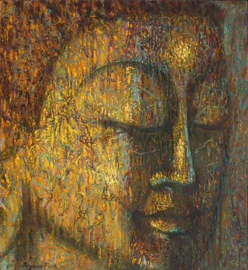 Sitting in meditation one morning, the idea struck: Paint the face of Buddha! I felt “called” to this. I had always loved to paint faces (see Heads on Wood under Portfolio).